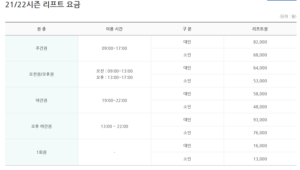 용평스키장은 주간 (09:00~ 17:00), 오전 (09:00~13:00) , 오후(13:00~ 17:00), 야간 (19:00~22:00), 오후 야간 (13:00~ 22:00) 이렇게 네 가지 리프트 요금으로 나누어서 판매합니다. 1회권도 판매하지만 1회만 타고 내려오시는 분은 아마도 거의 없겠네요. 다른 스키장과 비교했을 때 새벽 2시 까지 운영하는 스키장이 있는 반면에 용평 스키장은 밤 22시까지 운영합니다.