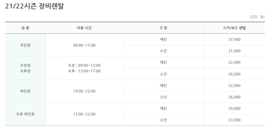 장비 렌탈 비용은 아래 표를 참고하세요. 장비는 용평리조트보다는 렌탈샵을 이용하시는 것이 저렴합니다.