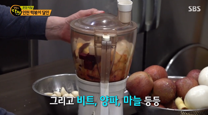 떡볶이 소스를 만들 때 물을 한 방울도 넣지 않고 배, 파인애플, 비트, 양파 마늘 등 비법재료를 넣고 갈아서 양념장을 완성 합니다. 재료에서 한 번 놀라고 달인의 정성에 다시 한 번 놀라게 됩니다.