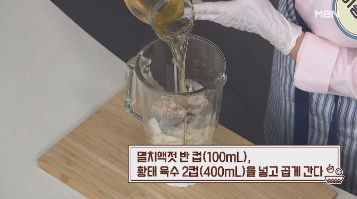 (10) 멸치액젓 반 컵 (100mL), 황태육수 2컵(400mL) 넣고 곱게 갈아준다.