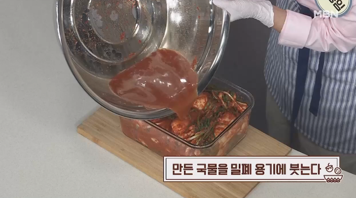 (16) 만든 국물을 밀폐 용기에 함께 붓고나서, 절인 배춧잎을 위에 덮어준다.