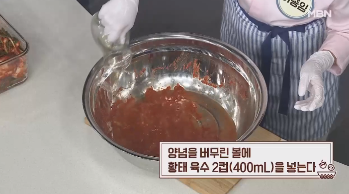 (15) 양념을 버무린 볼에 황태 육수 2컵(400mL), 소금 2큰술 을 넣는다.