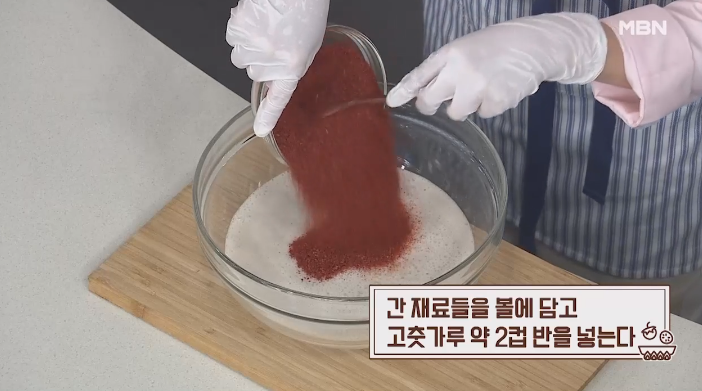 (11) 간 재료들을 볼에 담고, 고춧가루 약 2컵 반 넣는다.