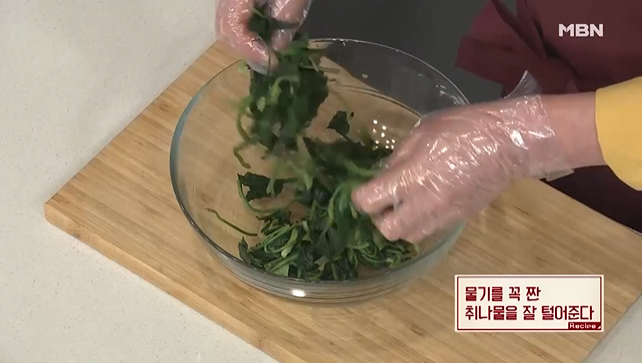 (4) 물기를 꼭 짠 취나물을 잘 털어준다.