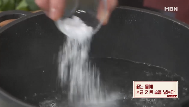 (1) 끓는 물에 소금 2큰술을 넣는다.