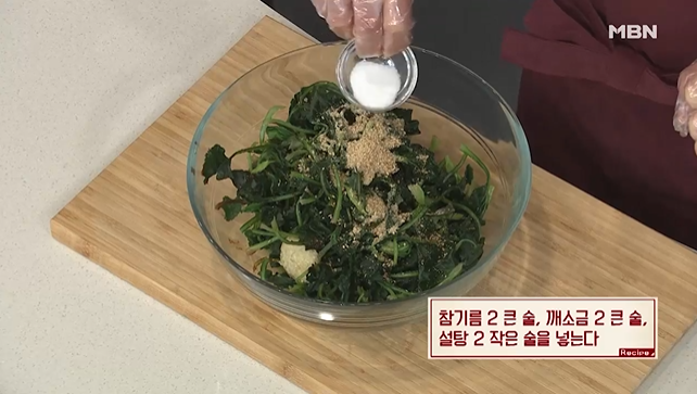 (6) 참기름 2큰술, 깨소금 2큰술, 설탕 2작은술 넣는다.