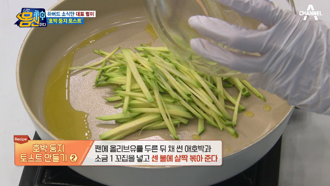 (2) 팬에 올리브유를 두른 뒤 채 썬 애호박과 소금 1꼬집을 넣고 센 불에 살짝 볶아준다.