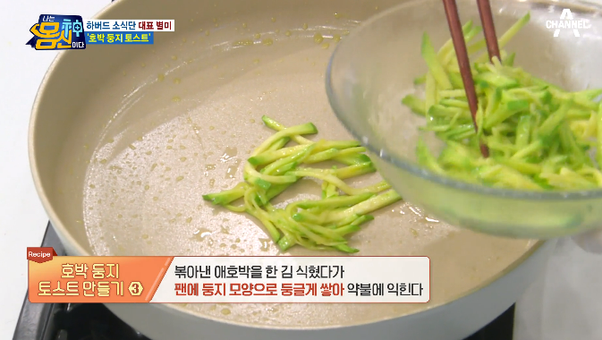 (3) 볶아낸 애호박을 한 김 식혔다가 팬에 둥지 모양으로 둥글게 쌓아 약불에 익힌다.