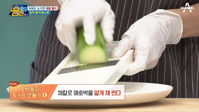 (1) 채칼로 애호박을 얇게 채 썬다.