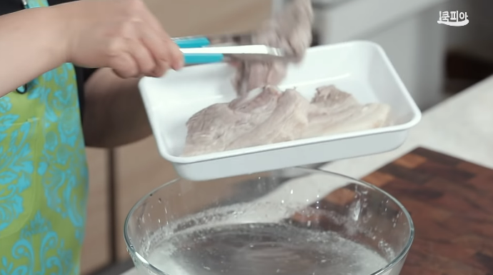 (8) 잘 익은 고기를 찬물에 한번 헹군 후 식혀서 얇게 썬다.