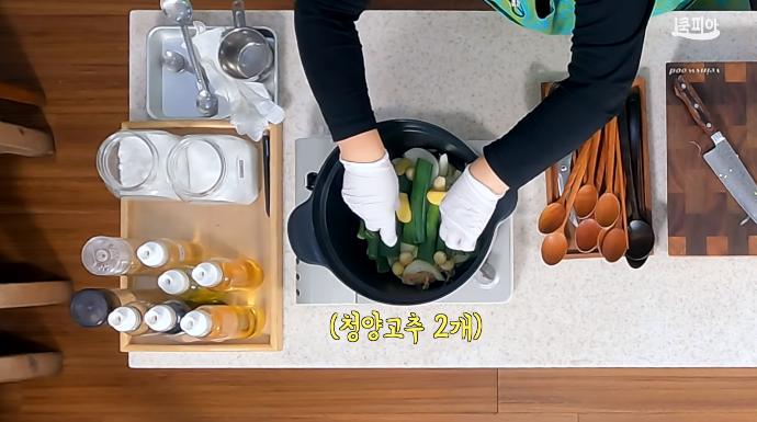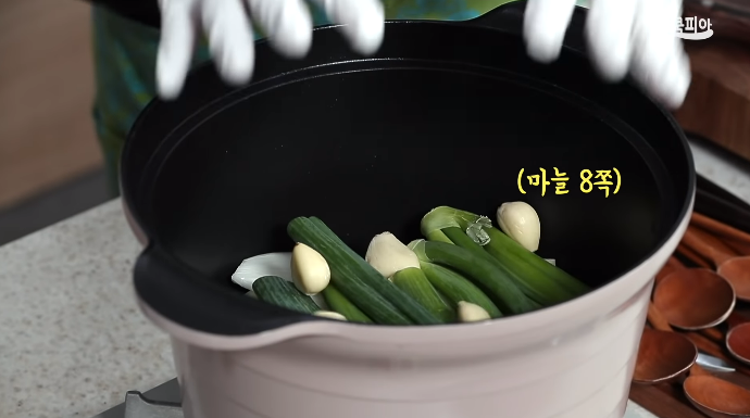 (2) 양파, 대파 잎, 대파 뿌리, 생강, 마늘, 청양고추를 손질해 넣는다.