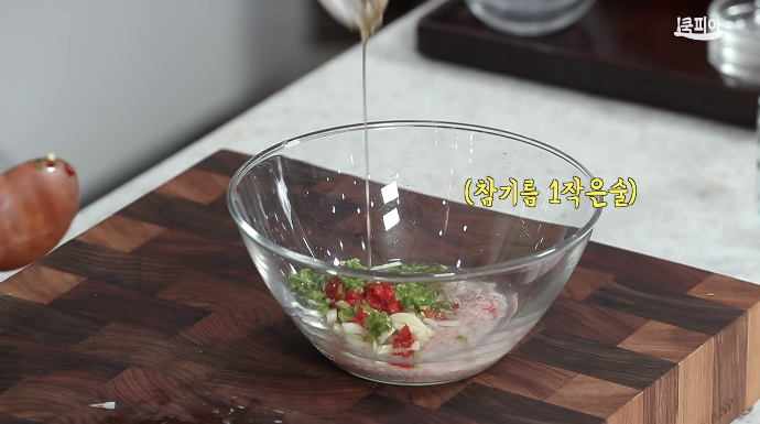 (6) 마늘채, 다진청양고추, 다진붉은고추, 참기름, 깻가루를 넣어서 양념장을 만든다.