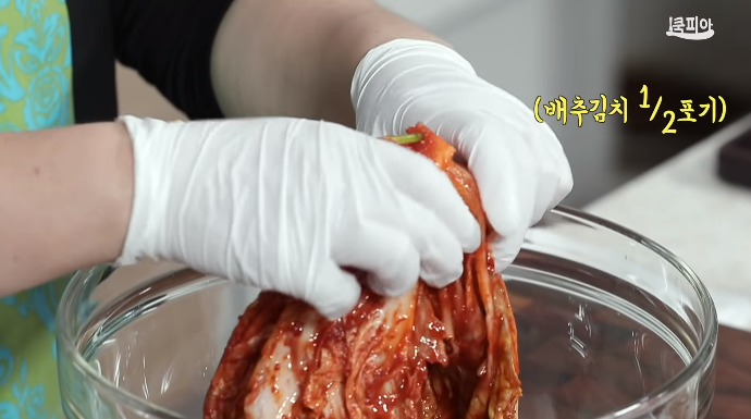 (9) 배추김치 1/2포기를 손으로 쭉쭉 찢는다.