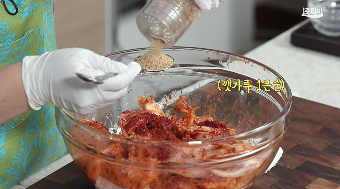 (10) 고춧가루, 국간장, 매실청, 참기름, 깻가루, 통깨를 넣고 버무려서 겉절이를 만든다.