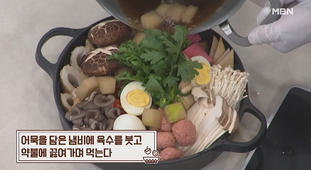 (21) 어묵을 담은 냄비에 육수를 붓고 약불에 끓여가며 먹는다.