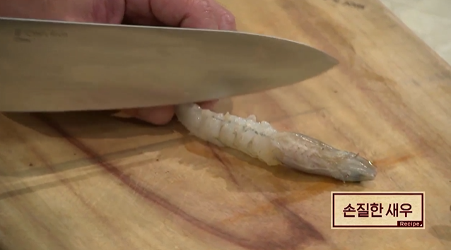 (3) 새우가 끊어지지 않게 배 부분에 칼집을 넣는다.