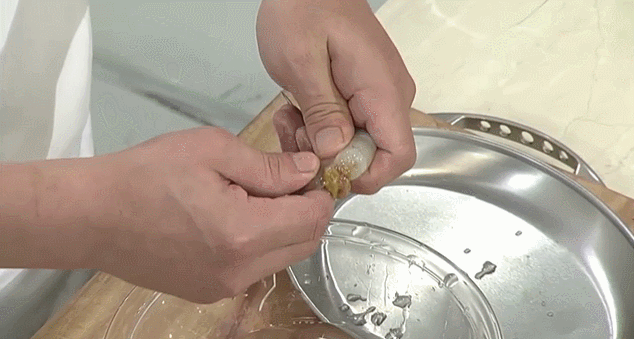 (2) 새우 머리가 떨어지지 않을 정도로 뒤로 젖힌 뒤 머리 부분을 살짝 눌러 내장을 뺀다.