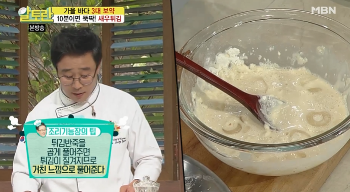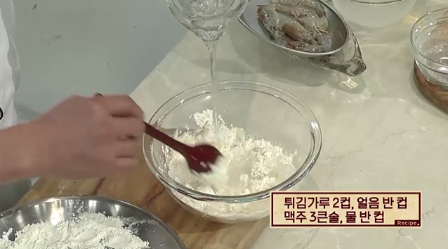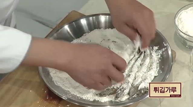 임성근 기능장님의 비법은 튀김 반죽에 얼음과 맥주를 넣는 것이네요. 그리고 반죽을 너무 곱게 섞지 말고, 약간 투박하게 섞어야 튀김이 바삭하게 잘 튀겨집니다.