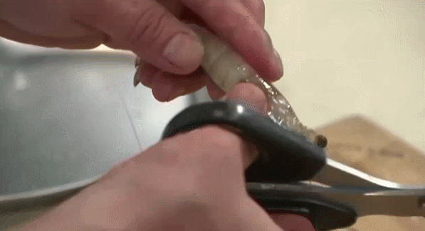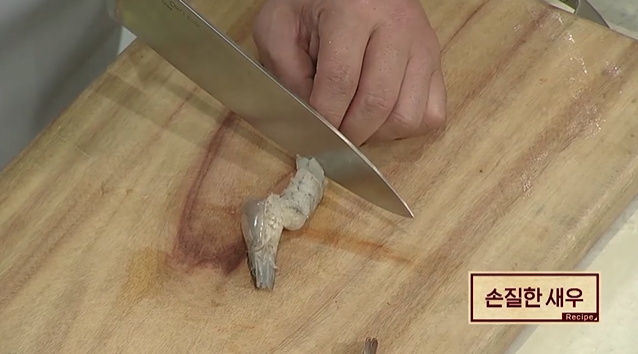 (1) 새우 뿔과 수염을 자르고, 다리를 제거한다.