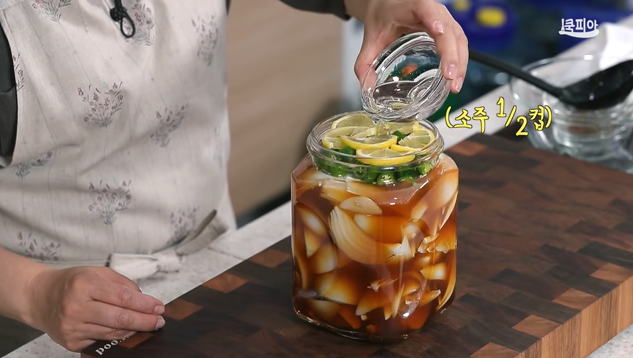 (4) 초장물을 붓고 소주를 넣어 밀봉 후 실온에 1시간 이상 둔 다음 냉장고에 넣고 차게 먹는다.
